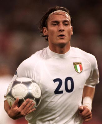 10- فرانشيسكو توتي: لاعب وسط يلعب لنادي روما. ولد في 27-9-1976. لعب 55 مباراة دولية وسجل 9 اهداف بينها هدف الفوز على استراليا (1-صفر) في الدور ثمن النهائي من ركلة جزاء. مباراته الدولية الاولى ضد سويسرا (2-صفر) في 10-10-1998. صانع ألعاب وهداف من الطراز الرفيع. بدأ مسيرته مع روما عندما كان عمره 16 عاما وبقي وفيا له حتى الآن. الفتى المدلل لفريق العاصمة، يعتبر خليفة روبرتو باجيو في المنتخب بيد ان تصرفاته الغريبة احيانا داخل الملعب تكلفه غاليا وهو ما حصل في بطولة امم أوروبا عندما تعرض للإيقاف بسبب بصقه على مدافع دنماركي. قاد روما الى إحراز اللقب عام 2001. |